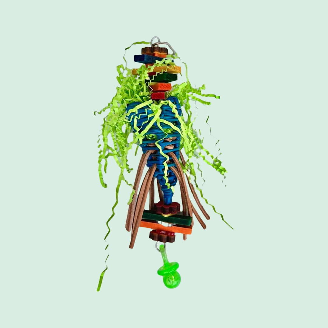Shreddable toy made of wicker, crinkle paper, leather, and wood.