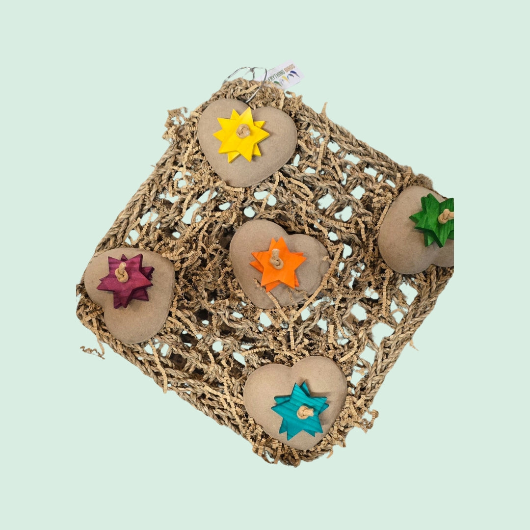 Grass mat with wooden stars and cardboard hearts